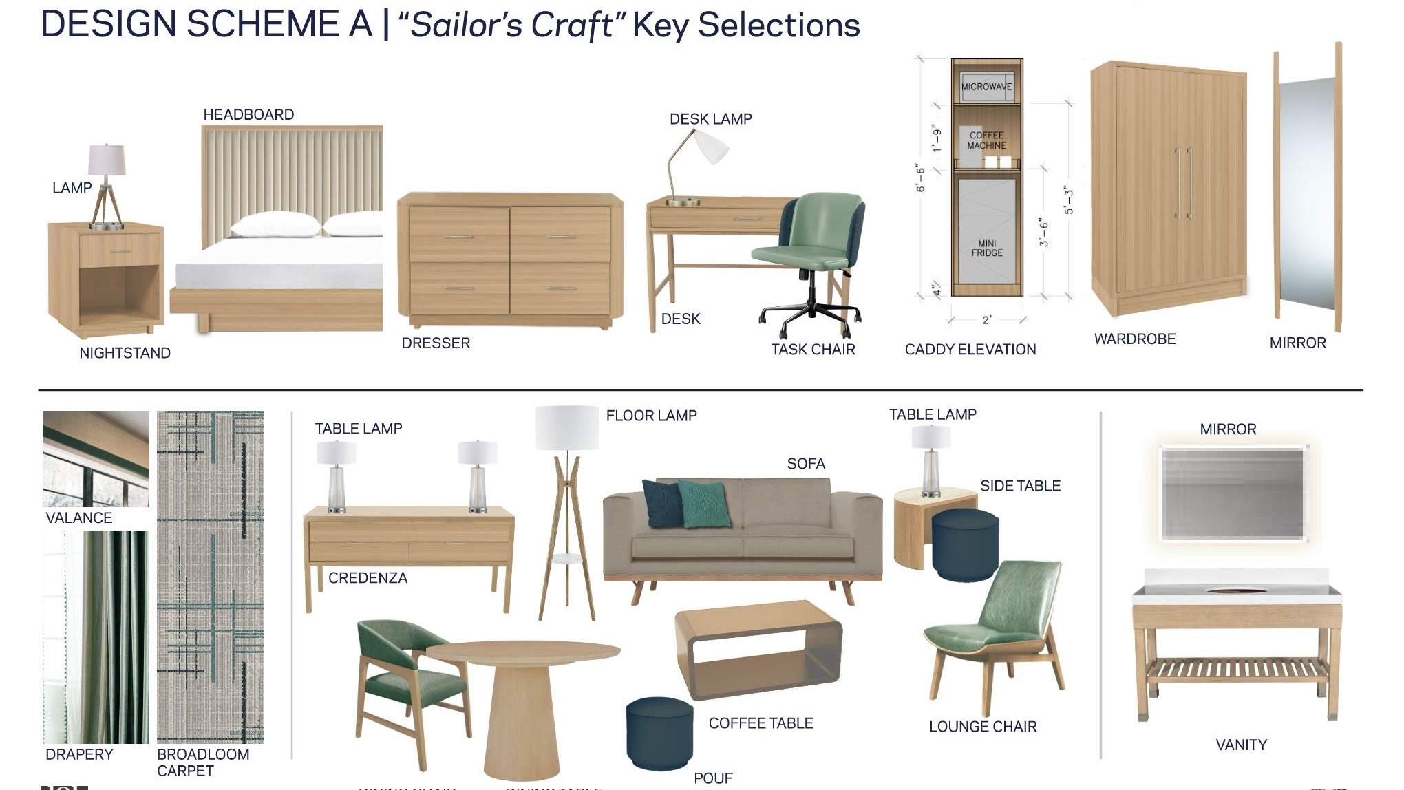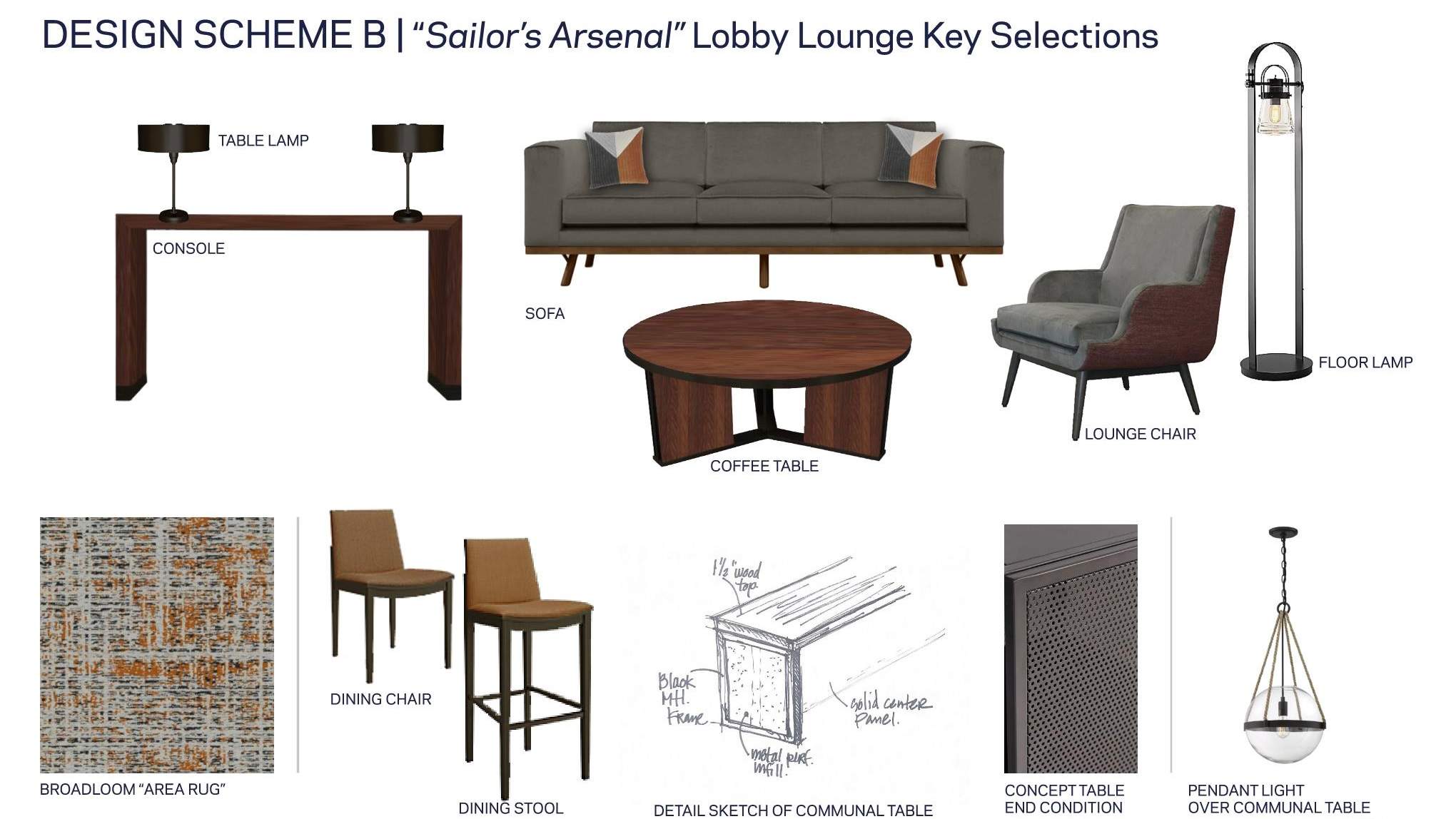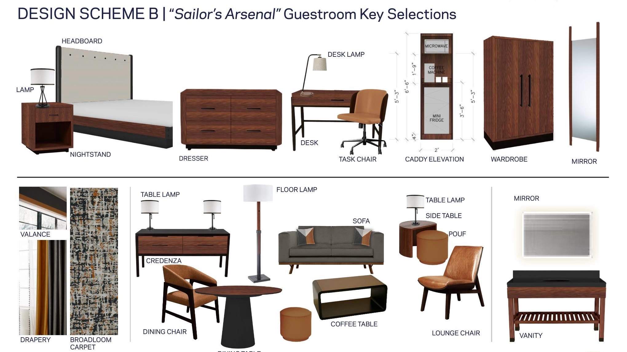 Sailors Arsenal, Sailors Craft, and Tailored Character represent three design lenses for Navy hospitality. Arsenal embodies strength and precision through bold, durable materials. Craft highlights tradition and human touch with tactile, handcrafted details. Tailored Character brings refinement and adaptability, balancing sophistication with local cultural expression. Together, they create a consistent yet flexible design language that ensures comfort, identity, and pride across Navy properties worldwide.