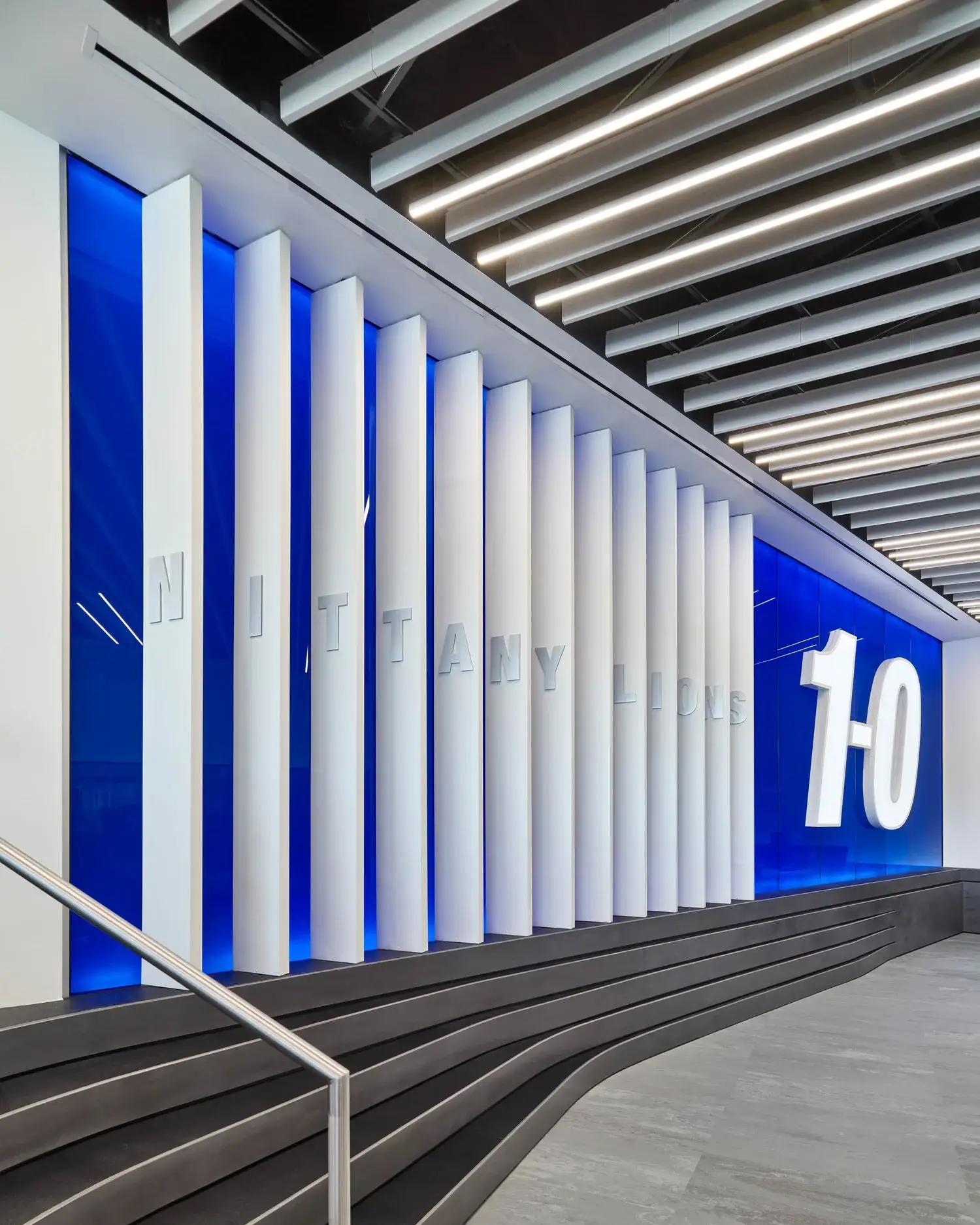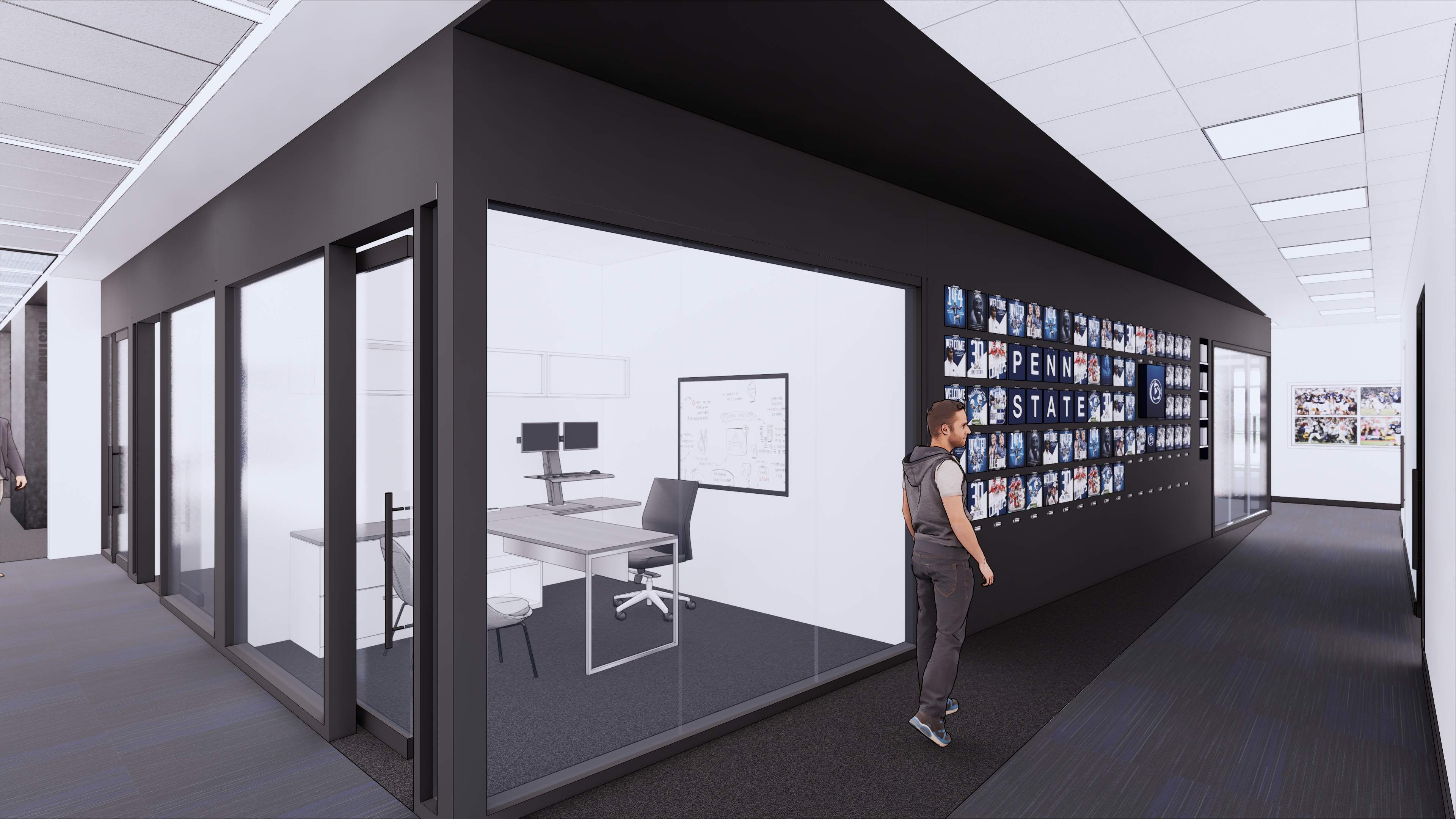 On the second floor, the renovation of the office suite and head coach’s office introduced a more open, collaborative workplace. A central gathering space with a pantry was designed as both a functional hub and a showcase, displaying past trophies and achievements as a daily reminder of Penn State Football’s tradition of success.