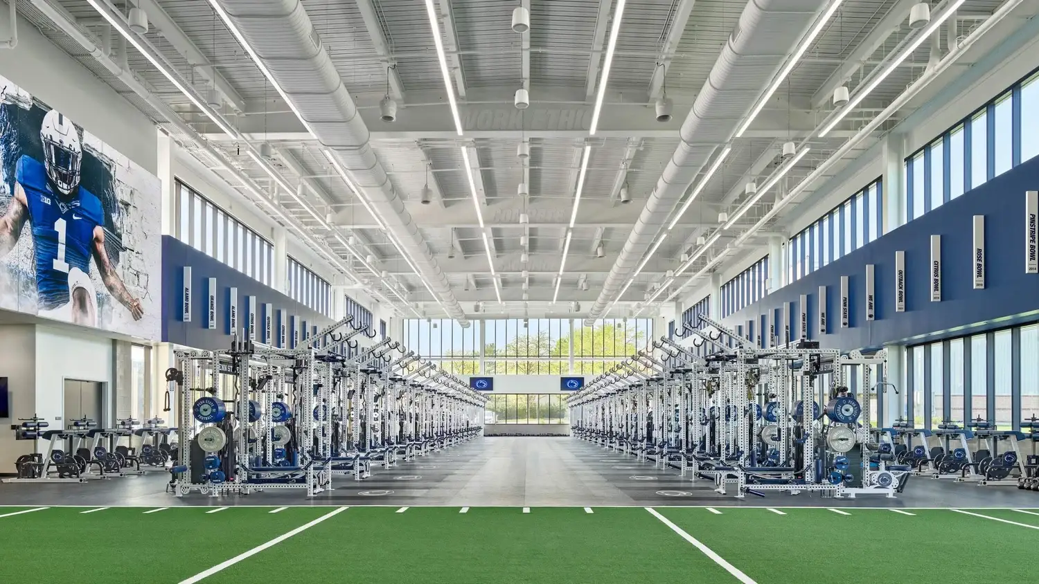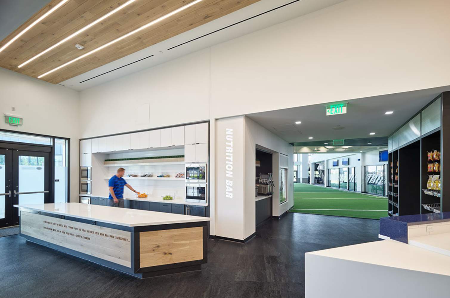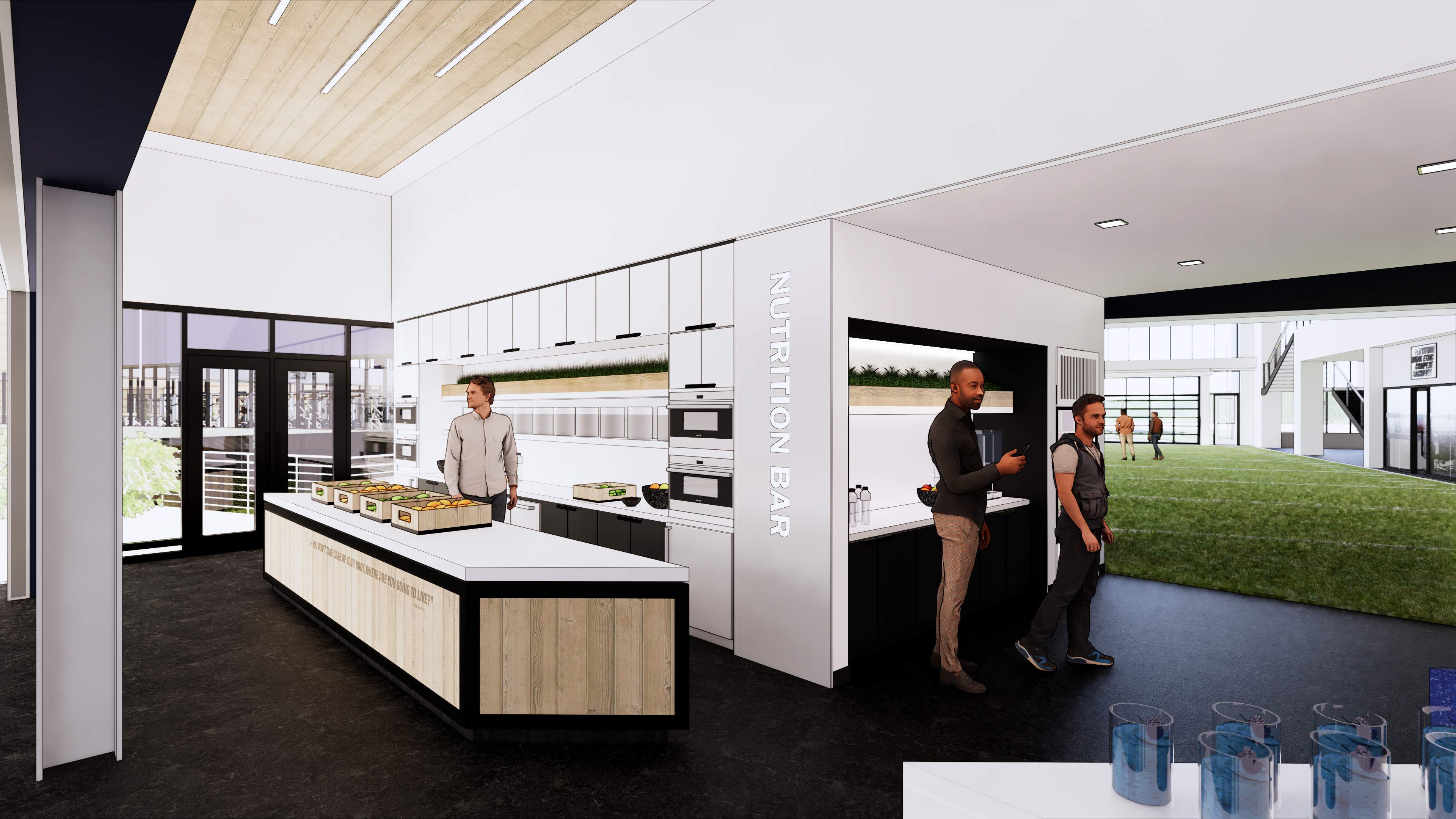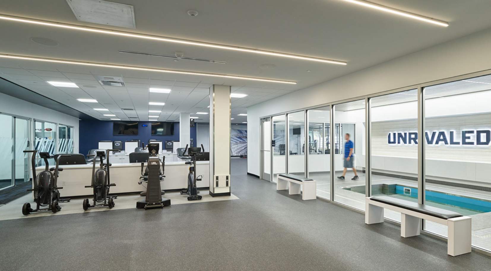 The addition includes a large weight room with direct connection to the practice field, a nutrition bar, sports medicine and rehabilitation suites, and a hydrotherapy pool—spaces designed to advance performance, recovery, and wellness.